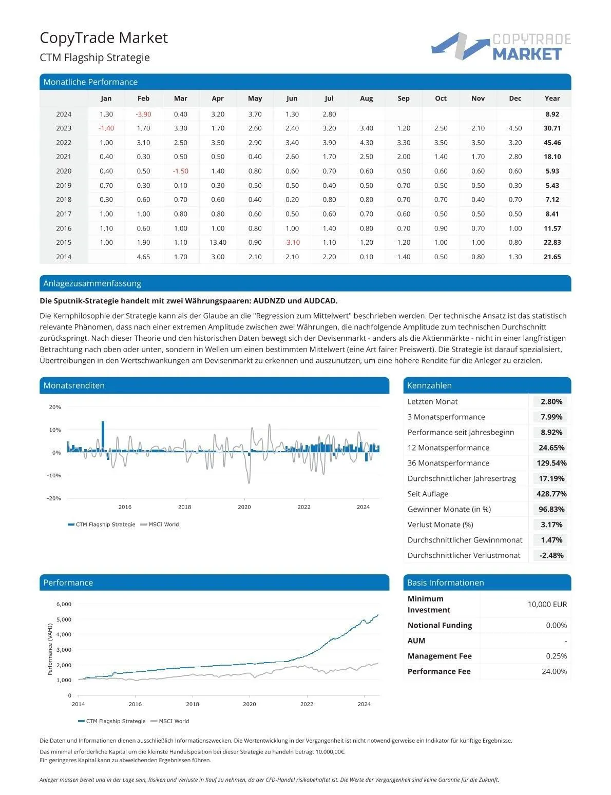 Copytrade Markets ist die einzige Copytrading-Plattform, die in Zusammenarbeit mit einem von der BaFin lizenzierten Vermögensverwalter betrieben wird. Unser Fokus liegt auf einem transparenten, rechtlich sicheren und voll digitalisierten Ansatz, der echte Diversifikation für Anleger ermöglicht. Mit einem Mindestinvestment von 10.000 Euro können Kunden in Strategien investieren, die unabhängig von traditionellen Märkten agieren und ihr Portfolio sinnvoll ergänzen.